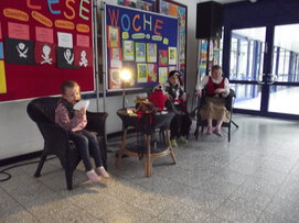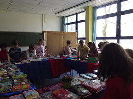 Bei uns dreht sich in dieser Woche alles um das Thema Bücher und Lesen. In den einzelnen Klassen stellen die Kinder ihren Freunden ihre Lieblingsbücher vor und es gibt kleine und große Leseaktionen, manchmal soar eine Lesenacht. Im Bewegungsraum gibt es dann für alle eine große Buchausstellung der Buchhandlung Hornung aus Unna. Die Kinder dürfen ausgiebig schmökern und Wunschzettel schreiben. Im Wechsel mit der Projektwoche dürfen sich die Kinder in der Vorlesestunde der Lehrerinnen einmal zurücklehnen.